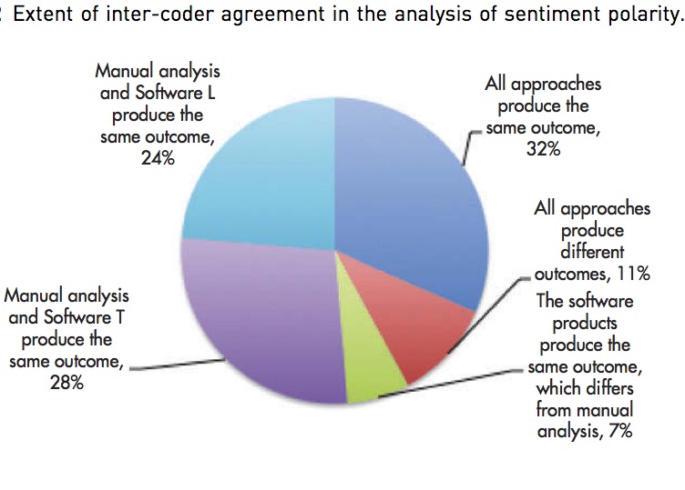 In our study, not only were multiple types of software used, but also software products from both a commercial and an academic origin were employed. There were no marked differences in performance between the various products, indicating that this is not a failure of one product or the other but, rather, a challenge presented by the subject matter (emotions and sentiments) and by the channel, with its technical limitations and very specific culture and netiquette. These challenges are accentuated by the fact that the segments of text available on Twitter are very short, rich in abbreviations and slang, and often with typos or grammatical errors.