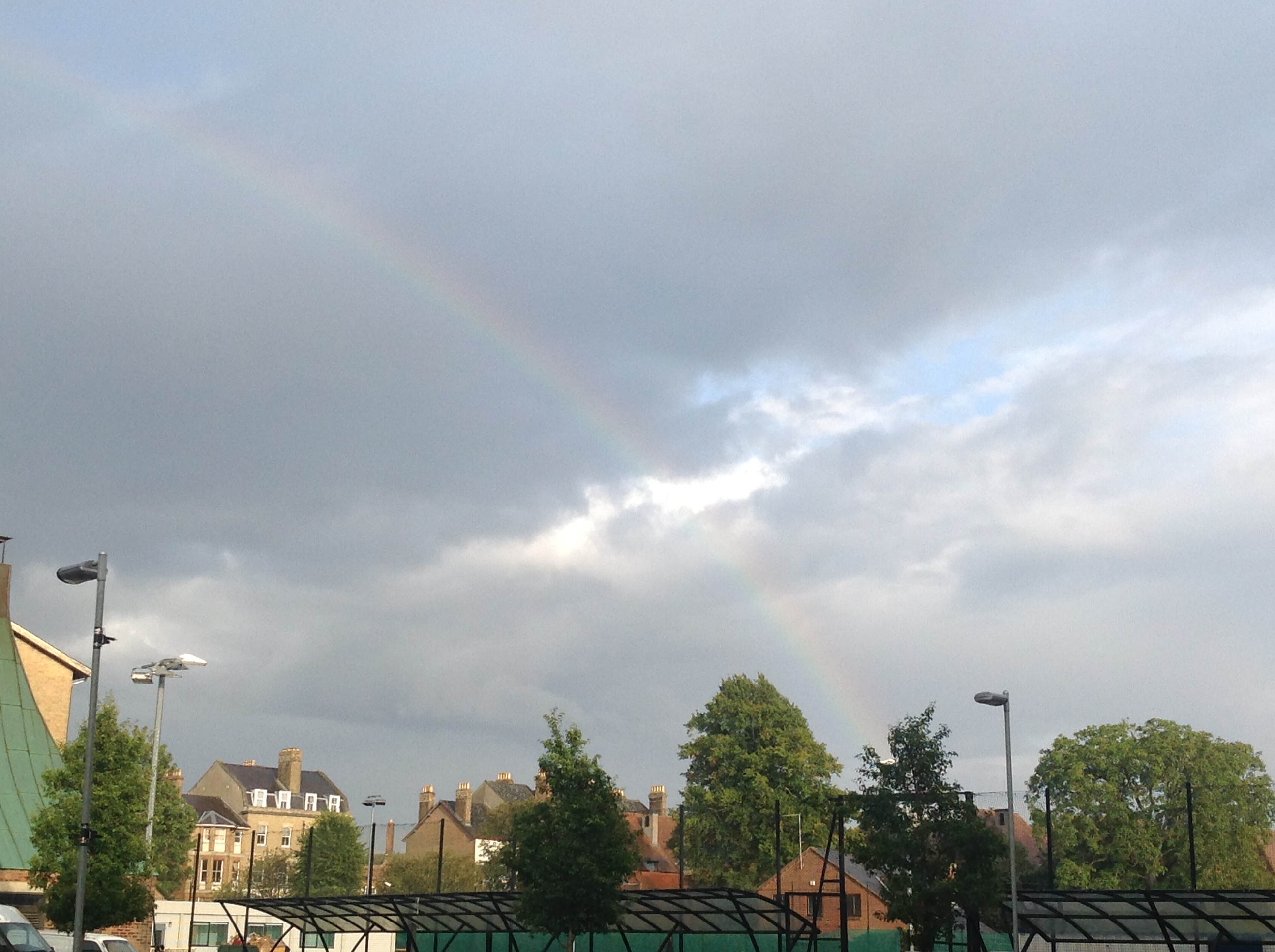 I leave my office at around 4h40m to pick up the youngest from school. I misread the e-mail with the instructions of when to collect him. So, when I arrive, he is already waiting for me, whereas I thought that I was arriving early. Not good. We then wait around 45 minutes for the eldest child. Ah well, at least the sun has come out and there is a rainbow.