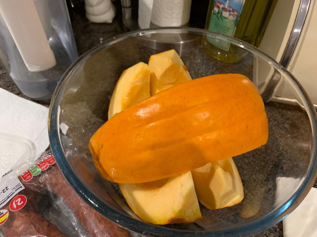 After snacks and showers, I pottered about in the kitchen. I decided to make some soup to use the pumpkin left from Halloween. And, then, things snowballed and I ended up baking chocolate and pear cake, and bread, too. Bizarre!