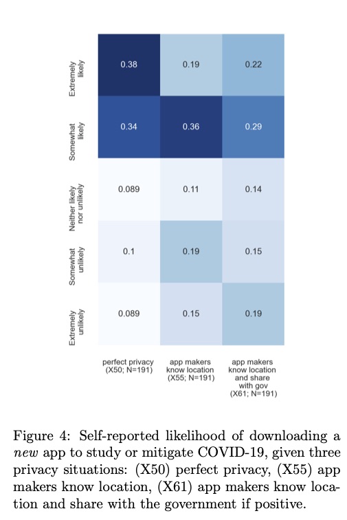 The responses also show that, if the app were to be offered by a company (as opposed to the government, a university, etc…), participants would prefer “a company that they already trust with respect to security and privacy and that they perceive to have the resources and domain knowledge to add location tracking and analysis. To some, it is important that location tracking is already the primary purpose of the app, if added to an existing app. Many expressed a more positive view of specific companies (e.g., Google) or apps (e.g., Google Maps), even before Google and Apple announced their efforts.” (page 2).