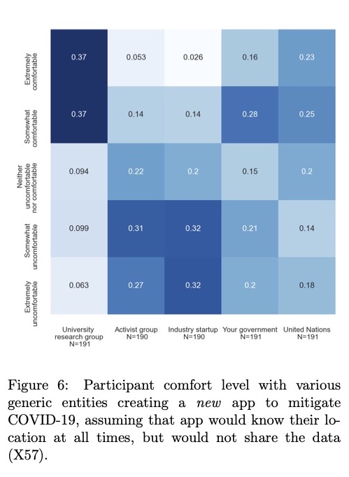 The qualitative responses help us understand why this is the case: participants are very uncomfortable with their data being used for purposes other than those for which the data were initially collected. When asked who they would trust the most to run a new app that would monitor their location, respondents showed strong preference for a University Research Group because “(universities) have little to gain by having my data other than to use it for its intended reasons” (page 13).