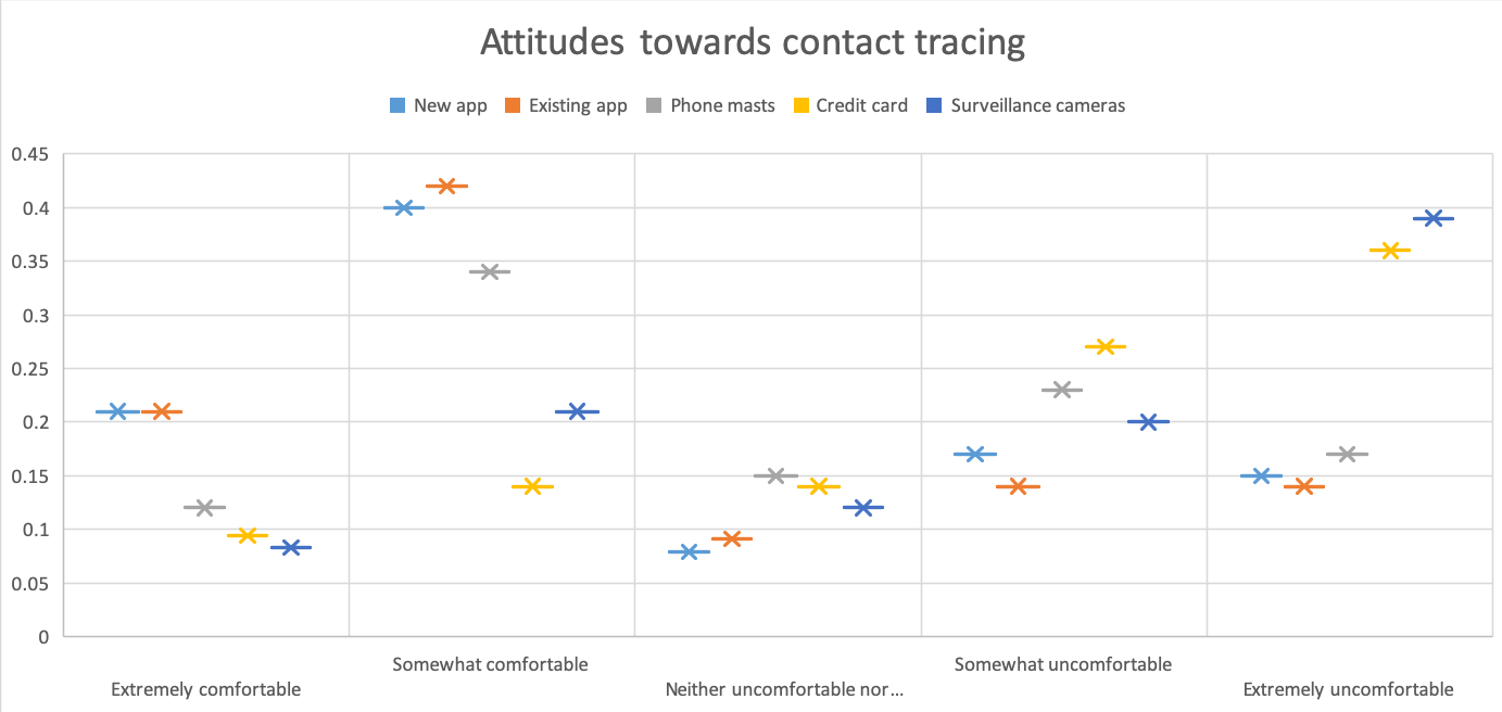 However, in my view the paper offers very interesting insight into the survey respondents’ view of contact tracing, because it considers various mechanisms for identifying and alerting those that might have been in contact with someone with Covid-19. Specifically, the survey considered the following options: