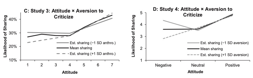 In their third and fourth studies, the authors tried to explore why customers are averse to offer criticism. They found that participants that anthropomorphised a brand were significantly less likely to offer negative feedback (left hand side of graph C, dotted line). Furthermore, they found that those that felt uncomfortable expressing criticism generally were significantly less likely to offer negative feedback, though neither more nor less likely than others to offer positive feedback (dotted line in figure D).