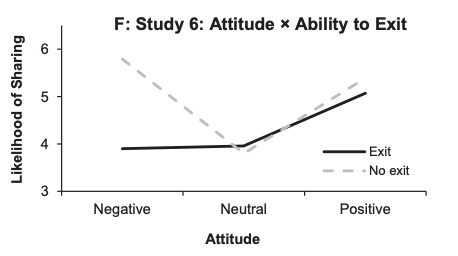 Then, study 6 examined whether customers’ feedback behaviour changed as a result of the type of options that they had available. The researchers found that customers are less likely to complain when they have an option (e.g., return the item), than when they feel that they have no alternative. Again, there was no difference in terms of positive feedback. The availability of an option is presented by the solid line in figure F, and the lack of option by the dotted line.