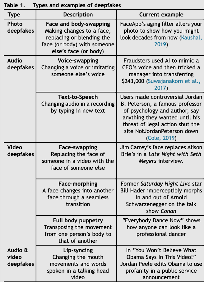 In the paper “Deepfakes: Trick or treat?”, Jan Kietzmann, Linda W. Lee, Ian P. McCarthy and Tim C. Kietzmann, published in Business Horizons, identify four types of deepfakes: