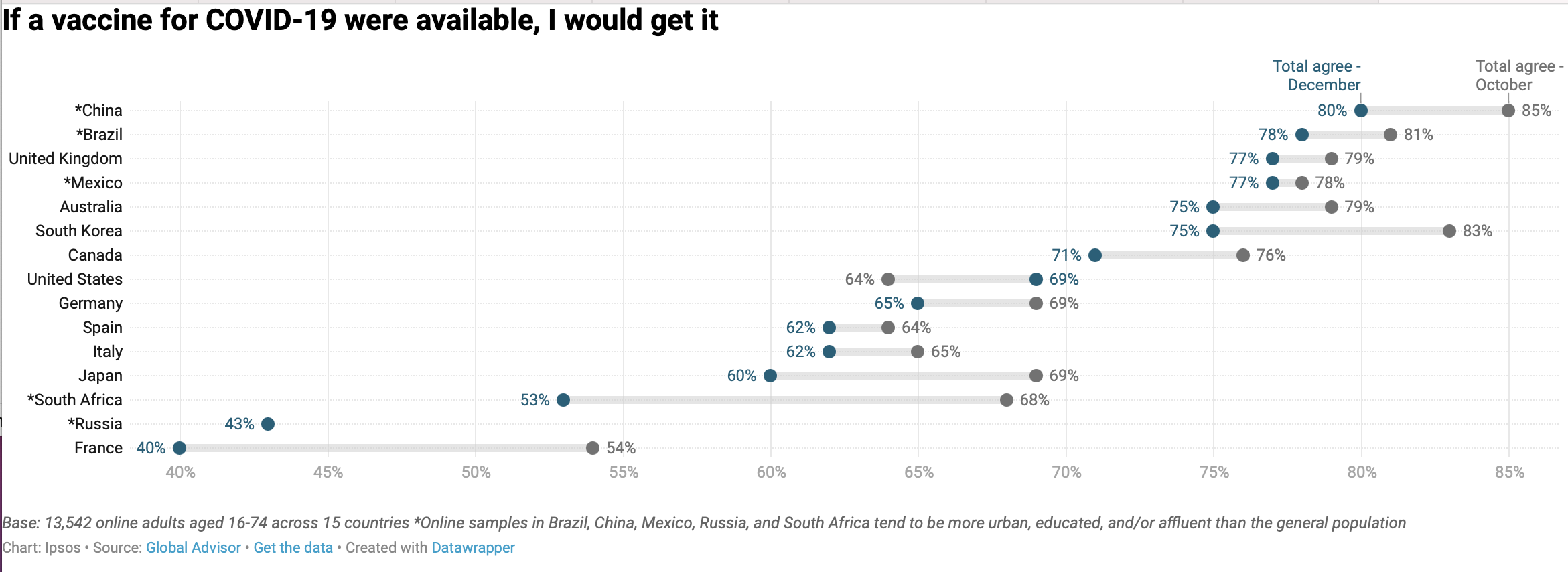 According to Ipsos Mori’s survey of Covid-19 vaccination uptake, intentions to get vaccinated are falling pretty much all around the world – except for the USA, where it has grown from 64% to 69%.