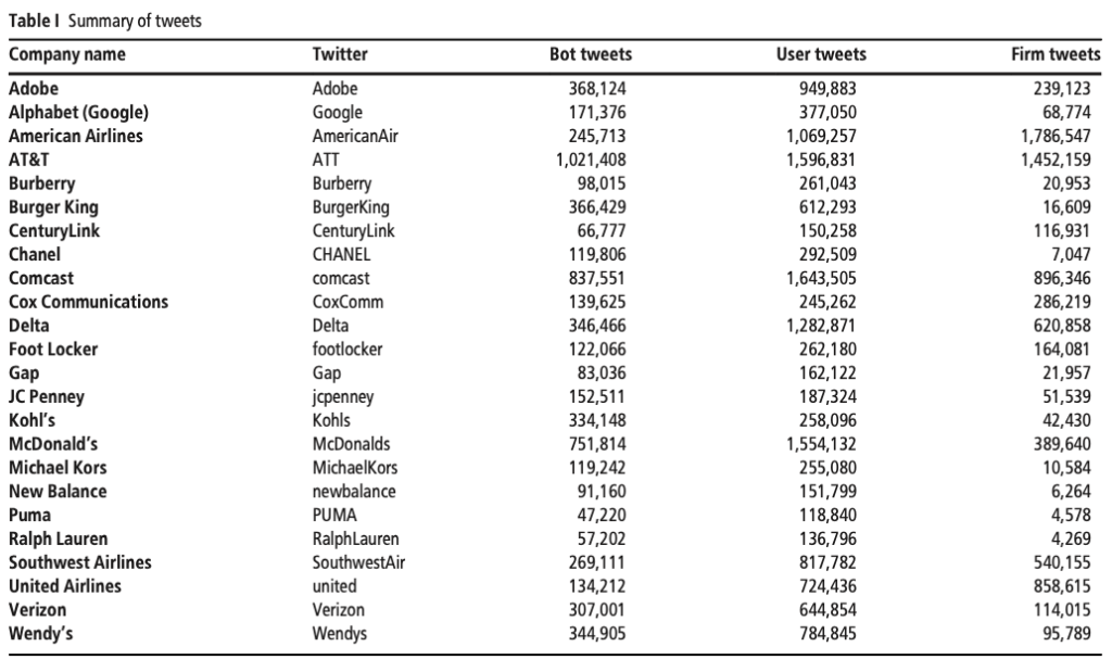 Liu collected tweets explicitly tagging a company account, from a sample 24 large companies. After separating the user generated messages from those tweets posted by the firms themselves, Liu found that social media bots were responsible for around one-third of the user-generated tweets (bots represented around one-sixth of the accounts in the study’s sample).
