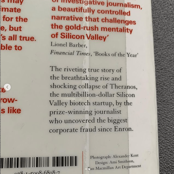 A non-fiction book about Theranos, a biotech start-up which purported to have created technology that could conduct a myriad of clinical tests from a tiny drop of blood collected from the finger. The technology would not only make blood testing much faster and easier; it would also make life more pleasant for people that need to have their blood tested regularly (e.g., cancer patients). It would also open the door for personalised medicine.