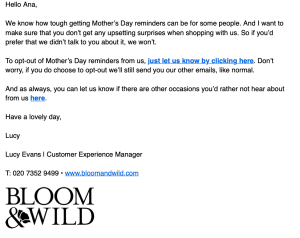 A much better, recent example of programmatic advertising was displayed by Bloom & Wild. Knowing that popular gift-giving dates, on occasion, may be painful for some of its customers, Bloom & Wild asks if you want to be kept out of mailing blasts for those dates. For instance: