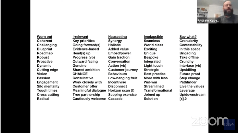 Also, stay away from what Kaye called “Drivel” – i.e., those words that add very little or no value to a piece of writing. For instance, instead of saying “evidenced based”, actually provide the evidence that you are alluding to.