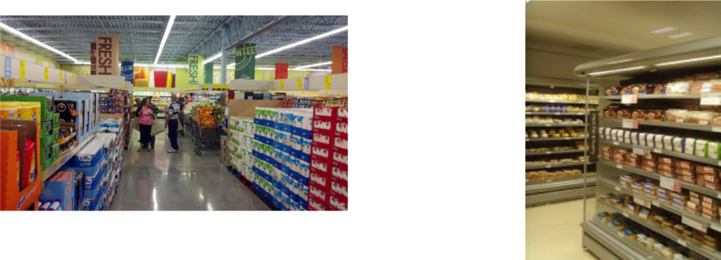 The spatial layout, furnishings and equipment, too, can shape our experiences and expectations. Consider, for instance, how the lighting, displays, etc… are so different in these two supermarkets: