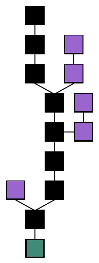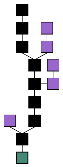 The ability to trace timestamped blocks through a chain makes it very difficult (though, not impossible) to change the data encoded in each block. For instance, in the chain depicted below, we could follow any of the blocks represented all the way back to its genesis (the green block).