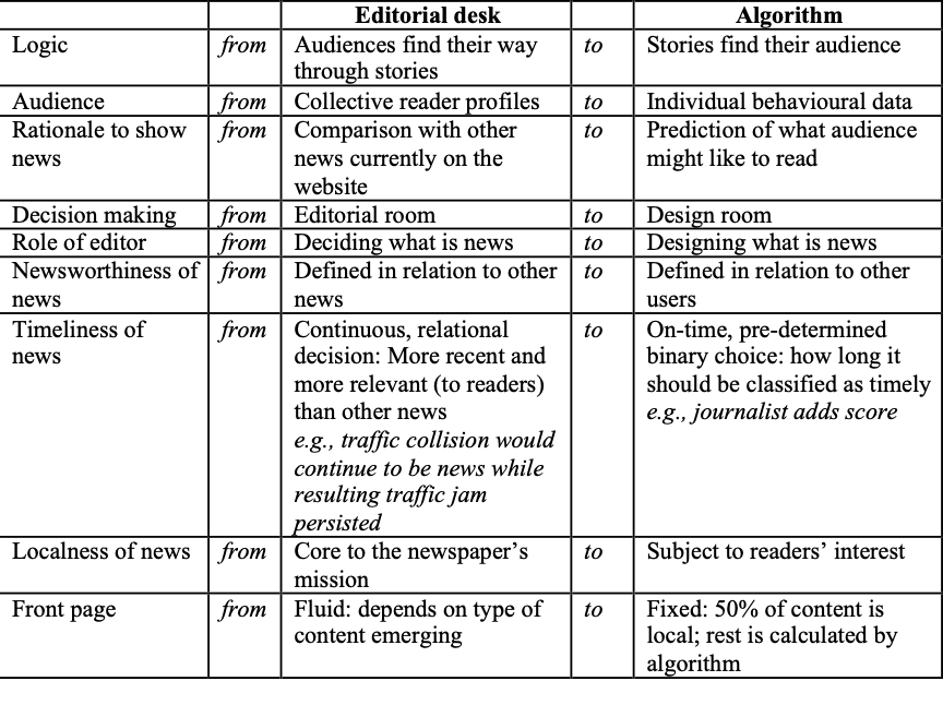The algorithm was introduced to personalise the news that were displayed for each reader, when they visited the newspapers’ website. Though, what we see in Hansen and Hartley’s paper, is that the introduction of the algorithm doesn’t just change the way the frontpage looked for different readers. Rather, in the process of quantifying what is newsworthy, and of committing the editor’s decision making to a formula that is binary in its working and can be applied across all articles, the algorithm changes the very essence of what is timely and local news and, therefore, of what is newsworthy or not.