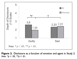 Participants were also more likely to disclose information to the AI (vs. human) agents when they felt guilt (e.g., for stealing). However, there wasn’t much difference in disclosure when they felt sadness (e.g., due to death in the family) because in those situations the over-riding need is social support (not lack of social judgment). When the research team used AI agents with enhanced empathy skills, disclosure of personal information in the sadness scenario increased.