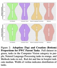 In relation to question 2, the authors found that the various task communities were creating new datasets (bottom of figure 2). However, “the newly created datasets are being used at lower rates” than the pre-existing datasets that had been developed for a different a task (page 8). Namely, “in more than half of Computer Vision communities, authors adopt at least 71.9% of their datasets from a different task” (page 6); though, the equivalent statistic for Natural Language Processing communities is 27.4%.
