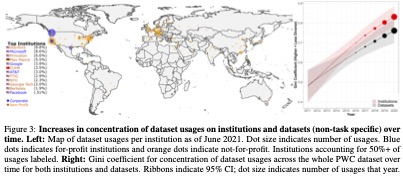 In relation to question 1, the team found that there was significant evidence of increasing concentration in fewer and fewer datasets, across various task communities included in this study. This is illustrated in Figure 1: