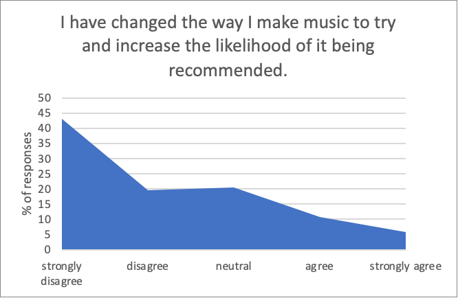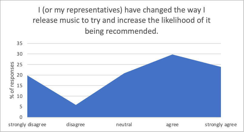 More than half of the sample reported that they had changed how they released their work, in order to increase their likelihood of being recommended by the system (Figure 3), for instance, by careful selection of tags to classify the track. In a way, it isn’t much different from other distribution channels, with “tags” substituting for shelves, or genres, or sections in store.