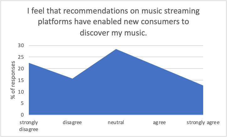 The creators surveyed in the Centre for Data Ethics and Innovation’s study expressed a similar sense of disappointment with the potential of music streaming services to enable them to reach wider audiences. As shown in figure 2, below, only a third of the artists felt that the recommendations on music streaming platforms had enabled them to do so. The interview data seems to indicate that the sentiment is spread across small and large labels (though, again, we lack detail about the interview responses to be able to understand who is benefitting, how or why).