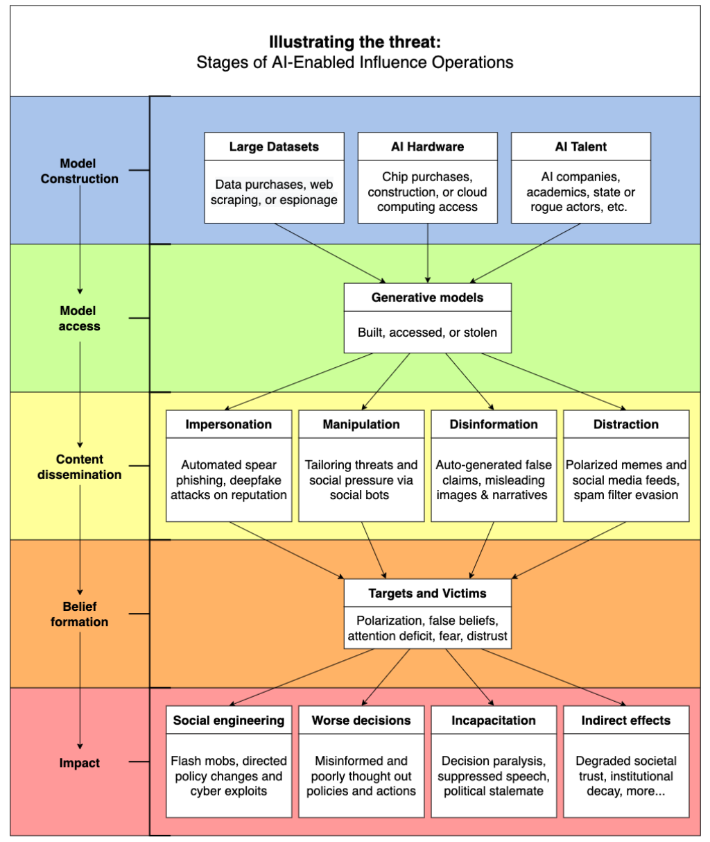 - As generative models drive down the cost of generating propaganda, smaller disinformation actors will now be able to afford influence campaigns, meaning that we will see a larger number of actors and more diverse in nature;