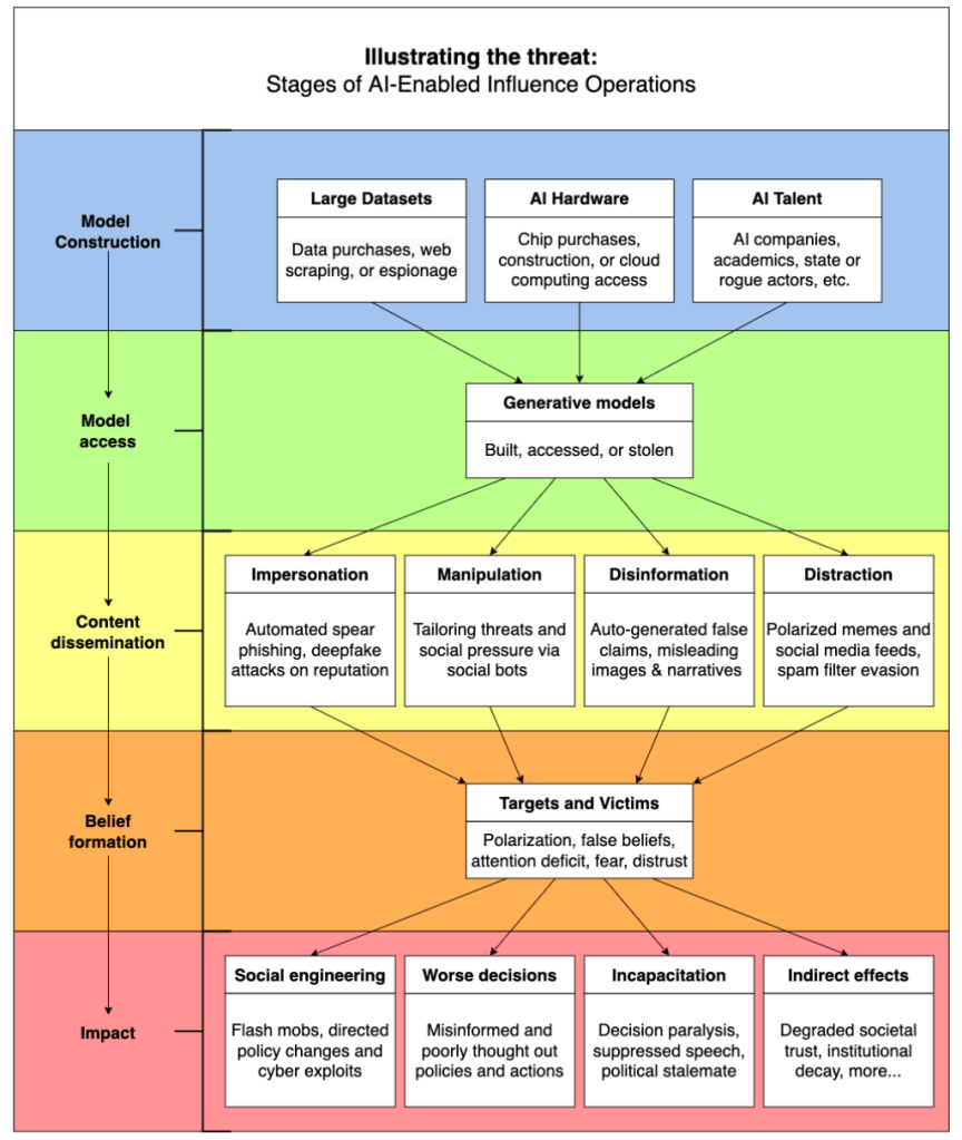 The authors go on to discuss various potential mitigating actions at the level of language models (as opposed to wider societal interventions such as education for digital literacy, for instance), for each of the stages of what they call “AI-enabled influence operations”:
