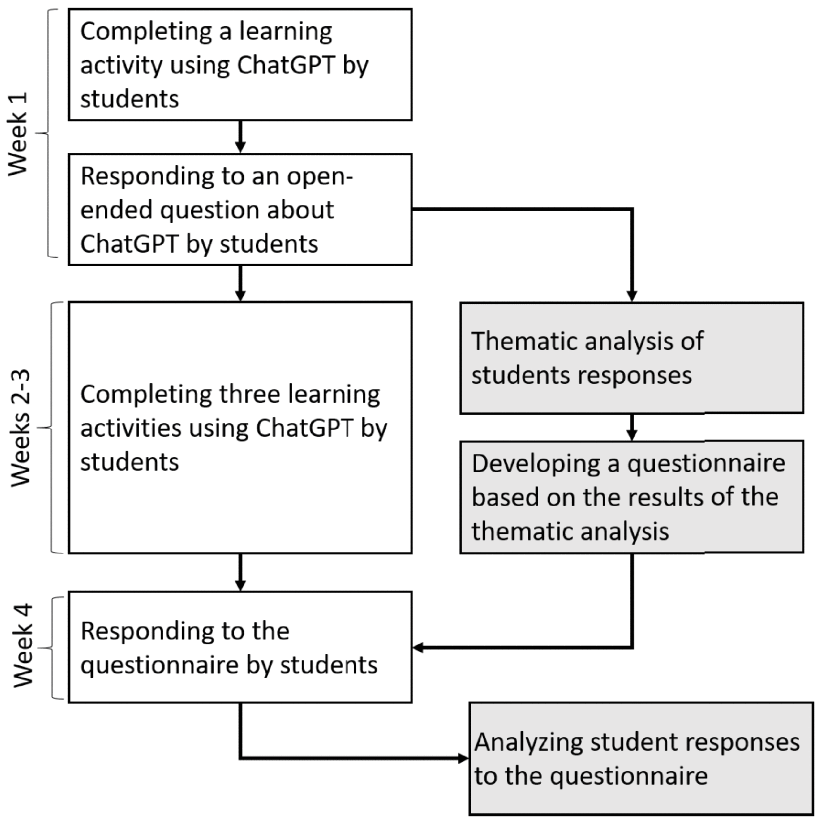 Another paper looked at the perceptions of students in a Computer Engineering degree, at a University in the UAE. The paper is entitled “Exploring Students’ Perceptions of ChatGPT: Thematic Analysis and Follow-Up Survey”, and was published in IEEE access. The methodology adopted by the author, Abdulhadi Shoufan, is outlined in figure 1 below: