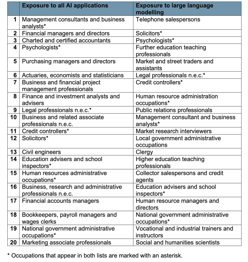 I have finally caught up with the “The impact of AI on UK jobs and training” report, published by the Department for Education. One interesting point in this report is that it looks at the impact of AI in general, as well as the impact of Large Language Models (LLMs) in particular. Though, it finds that the two are highly correlated. Here are the top 20 for each: