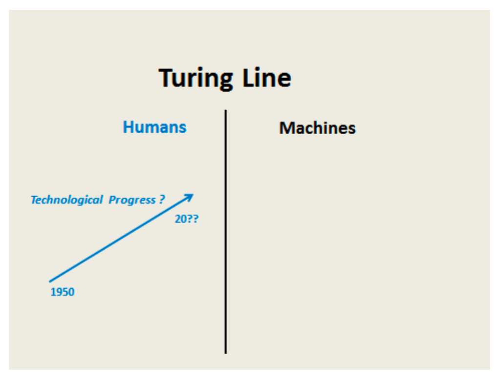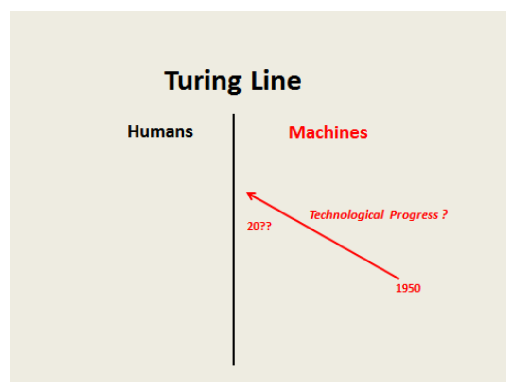 The Turing test aims to detect when a machine exhibits human-like intelligence behaviour by having an interrogator interact with an hidden party, for 5 minutes, via text. If the interrogator can’t confidently say whether the hidden partner is a human or a machine, then the machine is said to be human-like. This test, Frischmann argues, implies that there is a line separating humans from machines, and that technological progress brings technology closer and closer to that line, such that there is a point beyond which a machine is indistinguishable from a human being.