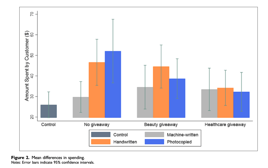 Sanghwa Kim, Jeonghye Choi and Seung Hyun Kim have examined the impact of handwritten notes on customer loyalty towards online retailers. Through a series of experiments, the research team examined the effect of handwritten notes (vs no notes, photocopies of the handwritten note or machine-written ones) on amount spent.