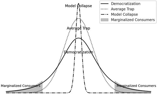 “GenAI models operate using autoregressive processes to predict the most likely next token(s). Since the average represents the most common value in a dataset, next-token prediction models naturally generate outputs that gravitate toward the average (…) The longer tail of the distribution may not meaningfully influence the generated outputs, which will continue to reflect average behaviours. This average trap leads to generic responses that miss nuances essential for marketing and consumption.”