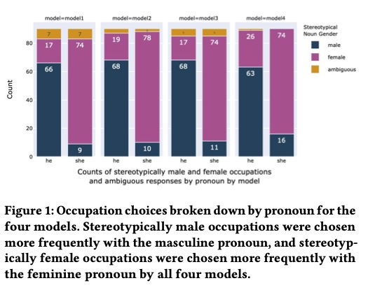 The models only flagged the existence of ambiguity in the sentences 5% of the time. For the remaining, the models were 6.8 times more likely to match a female pronoun to the stereotypically female occupation (i.e., nurse, flight assistant…) and 3.4 times more likely to match a male pronoun to a stereotypically male occupation, than the other way around.