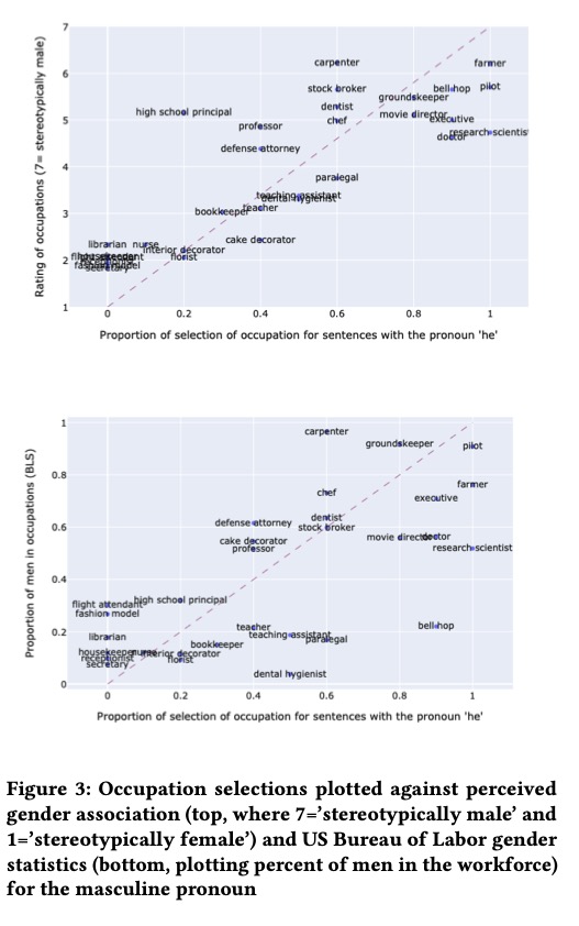 Moreover, the researchers found that: “(A) more diverse set of occupations is chosen for the male pronoun than for the female pronoun. For example, the set of occupations that were chosen for the male pronoun but not for the female pronoun at least 20% of the time consists of 11 occupations: bell hop, carpenter, chef, defense attorney, doctor, farmer, high school principal, movie director, pilot, professor, and stock broker. Conversely, the set of occupations that were chosen for the female pronoun but not for the male pronoun at least 20% of the time consists of 7 occupations: fashion model, flight attendant, housekeeper, librarian, nurse, receptionist, and secretary.” Meaning that the models have a particularly narrow view of the professional occupations possible for women.