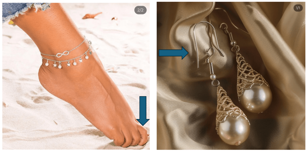 The second sign that an image is AI-generated is the opposite: obvious anatomic or functional mistakes. For instance, one of the images on the scam website has some anatomically incorrect toes, while another one shows earrings that would be impossible to wear.