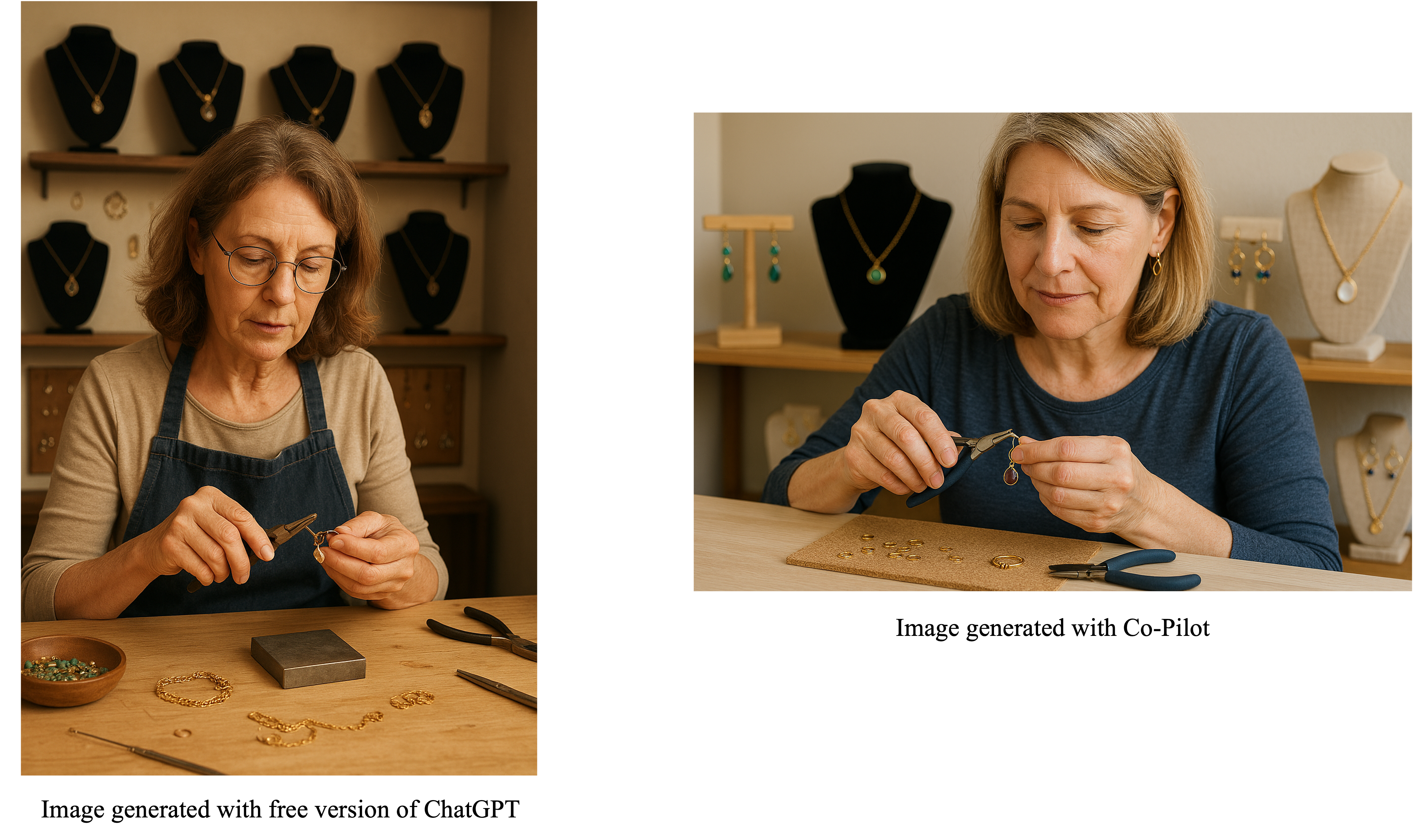When meeting the journalist, I started by demonstrating how easy, fast and inexpensive it is to produce similar images. For example, I generated the images below in a couple of minutes, using the prompt “Create an image of a middle aged, white woman, creating a piece of jewellery. the background should show displays of hand-crafted jewellry”. The one on the left was generated with the free version of ChatGPT, and the one on the right with Co-Pilot.